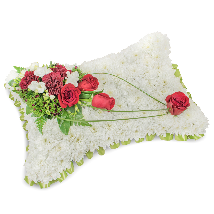 Crafted by our expert florists, this sympathy flower cushion is ideal for funerals, memorials or as a sincere gesture of support. The harmonious red and white colour palette symbolises love, respect and remembrance, making it a meaningful way to honour a life well lived.